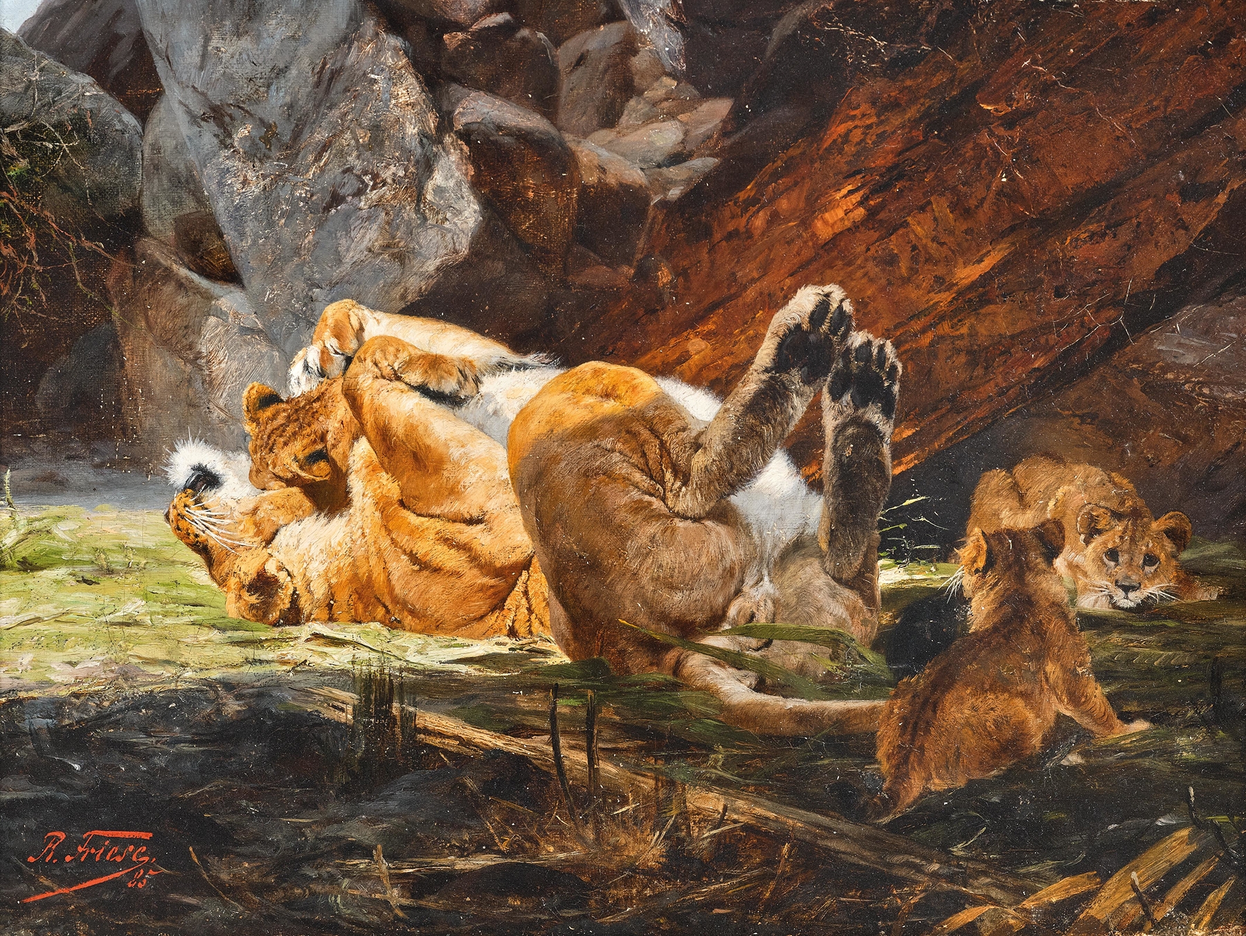 He was born in Gumbinnen. He studied at the Academy in Berlin, where, after traveling in the orient, in Norway, and as far as the polar regions, he rapidly acquired his present reputation as one of the best animal painters in Germany, especially noted for his vivid delineations of the lion’s life in the desert, and also of the native deer world in the German forest. He was awarded a gold medal in 1886, and elected a member of the Berlin Academy in 1892. He died in 1918 in Bad Zwischenahn.