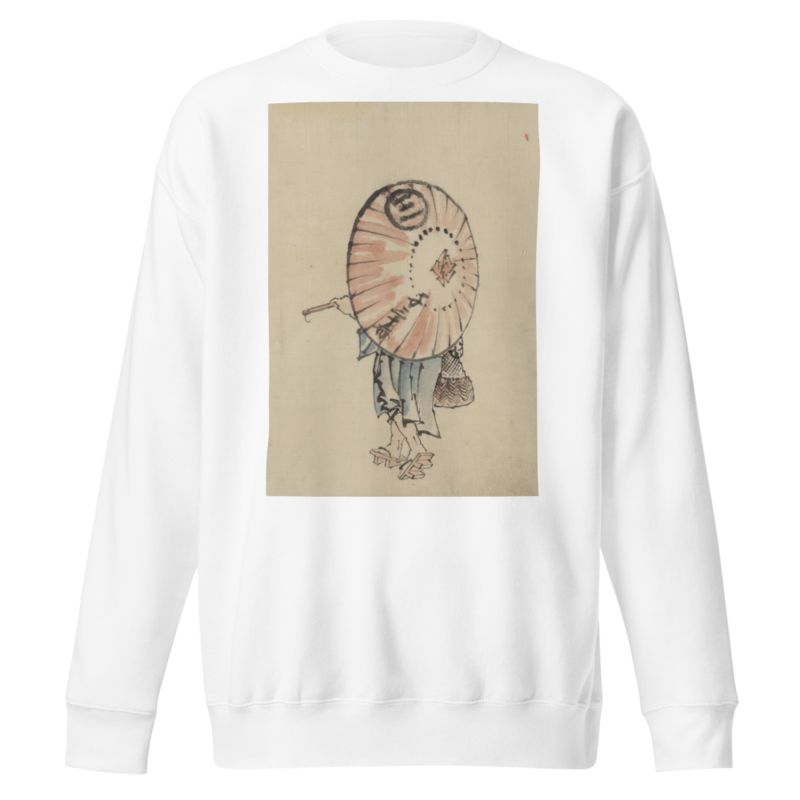 A person walking to the left, mostly obscured by an open parasol carried over the shoulder by Katsushika Hokusai printed on a Sweatshirt