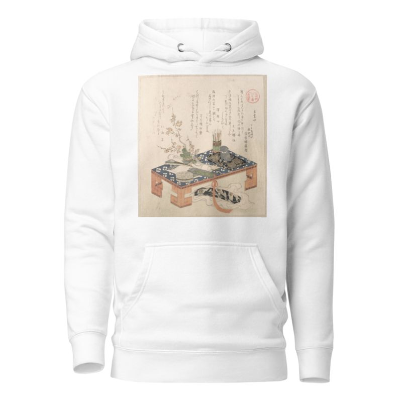 Desk with Writing Set and Plum Flowers by Kubo Shunman printed on a Hoodie