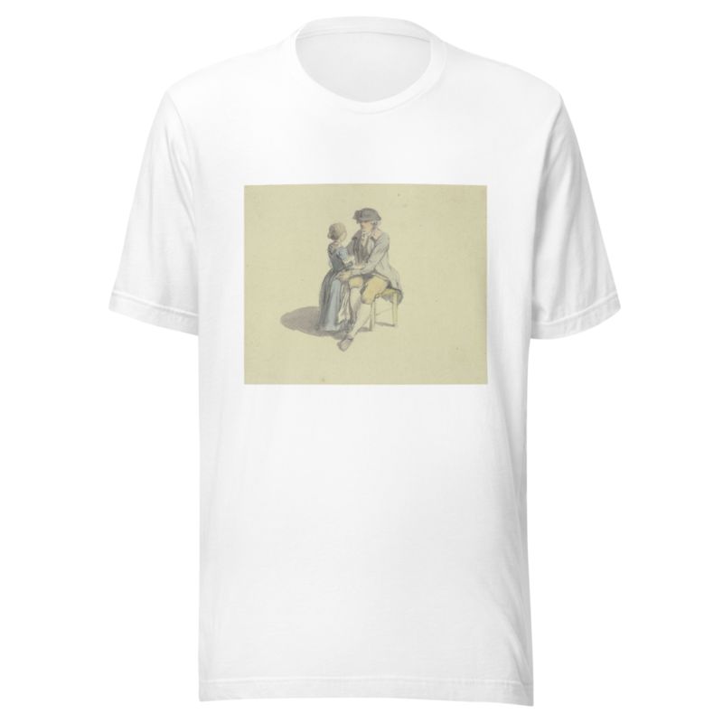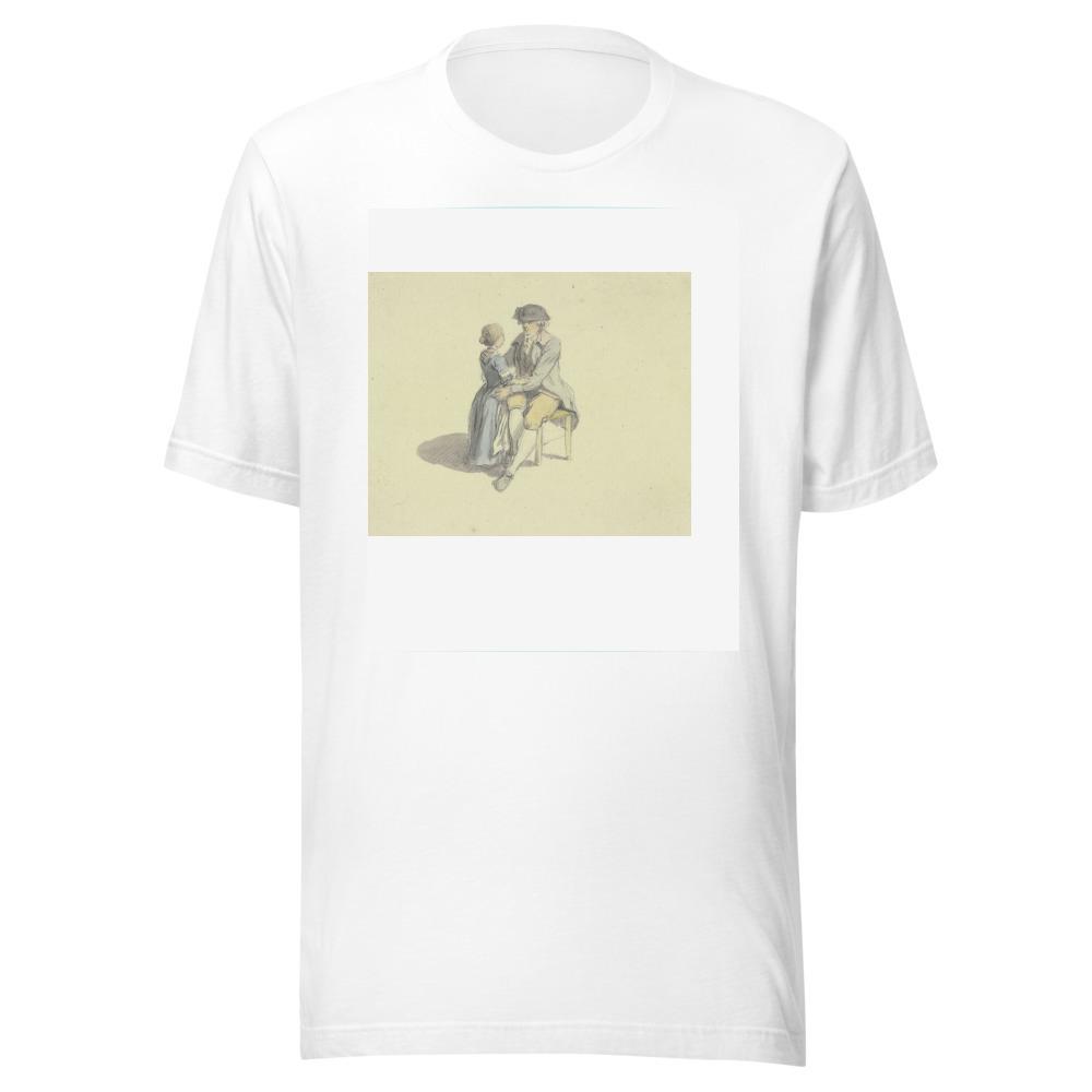 Ein Mann auf einem Stuhl sitzend in Unterhaltung mit einem Mädchen by Johann Ludwig Aberli printed on a T-Shirt