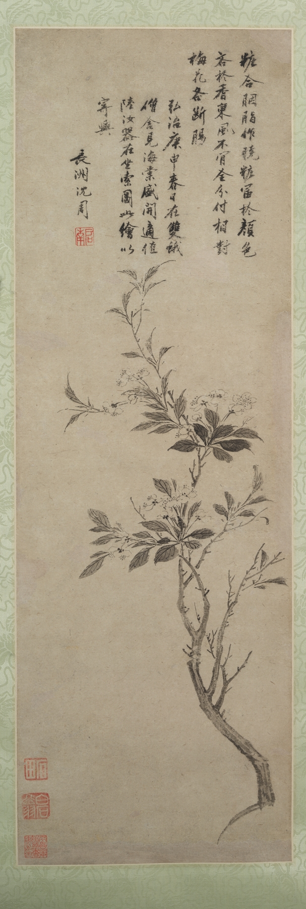 Shen Zhou’s scholarly upbringing and artistic training had instilled in him a reverence for China’s historical tradition that influenced both his life and his art from an early age. He was accomplished in history and the classics, and his paintings reveal a disciplined obedience to the styles of the Yuan dynasty, to China’s history, and to the orthodox Confucianism that he embodied in his filial life. He is most famous for his landscapes and for his “boneless” renderings of flowers, which are meticulously created in the style of the Yuan masters. However, he did not always paint within strict boundaries. His inherited prosperity afforded him the luxury of painting independently of patrons, and he did so in a way that, while revealing his historical influence, was uniquely his own. Shen possessed a large collection of paintings from the late Yuan and early Ming, which he and his scholar-painter colleagues used as models in forging the revivalist approach of the Wu style. He frequently combined experimental elements with the more rigid styles of the Yuan masters. Much of his work was done in collaboration with others, combining painting, poetry, and calligraphy at gatherings with his literati friends. It was upon these ideals that his Wu School was founded. For Wu painters, painting was a meditation, rather than an occupation. Shen Zhou never coveted his paintings, although they were frequently coveted and imitated by others. Through Shen Zhou’s eyes, a painting was not a commodity, but the very extension of the painter himself.