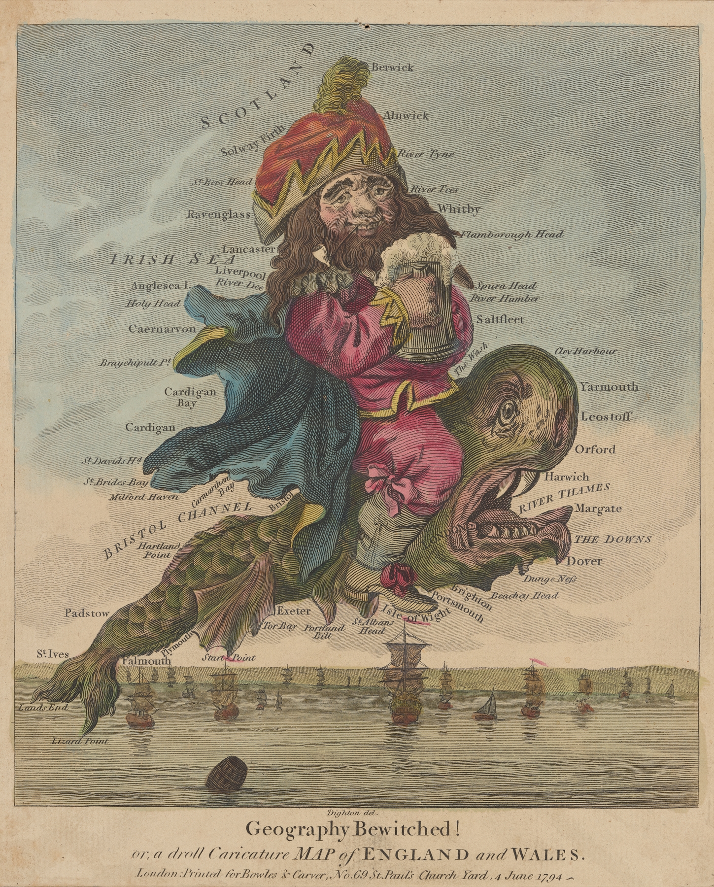 As an artist, he was first offered consistent employment by the publisher Carington Bowles (fl.1752–93). This was the heyday of the so-called ‘droll’ mezzotint and Robert’s output of designs, executed in watercolour and then engraved, was an integral part of his stock. Carington Bowles was among of the most active mapsellers of his day in London, which will explain Dighton’s caricature maps in his “Geography Bewitched” series, including Ireland, England and Wales and Scotland.