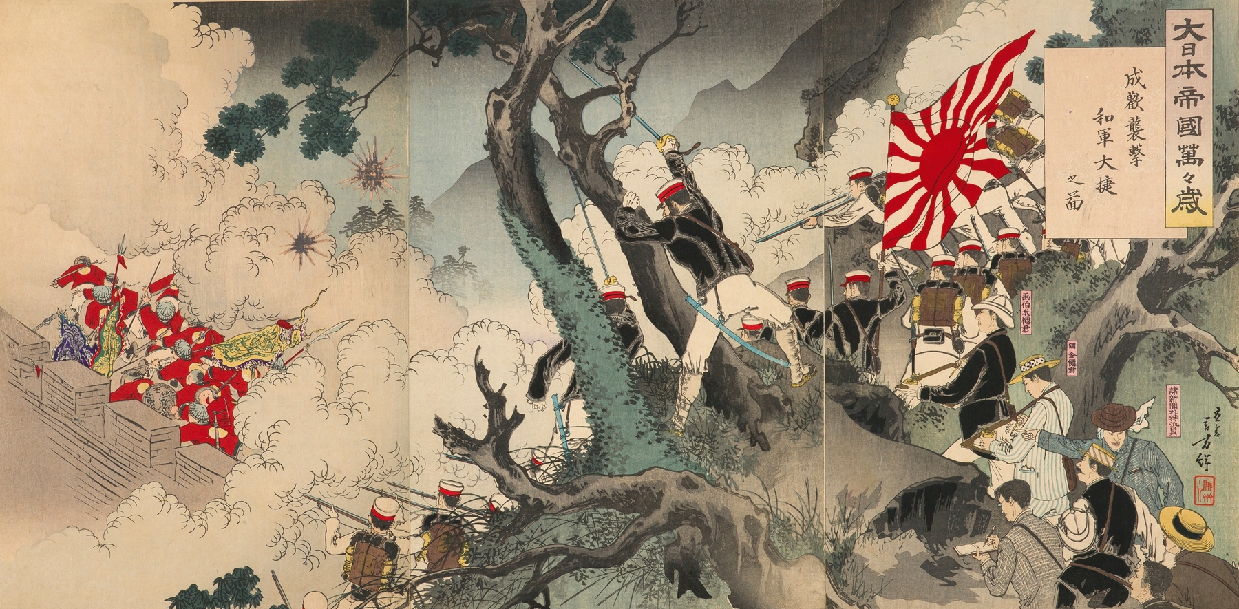 Hurrah and Hurrah Again for the Great Empire of Japan! Great Victory for the Japanese Army in the Assault on Seonghwan by Toshikata Mizuno printed on a T-Shirt