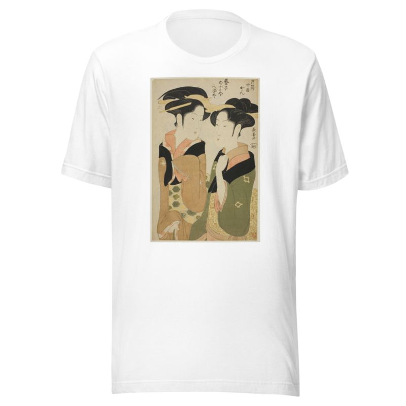Kan, a waitress of the Izutsuya, and the geisha Fuseya of the Ogiya II by Eishōsai Chōki printed on a T-Shirt