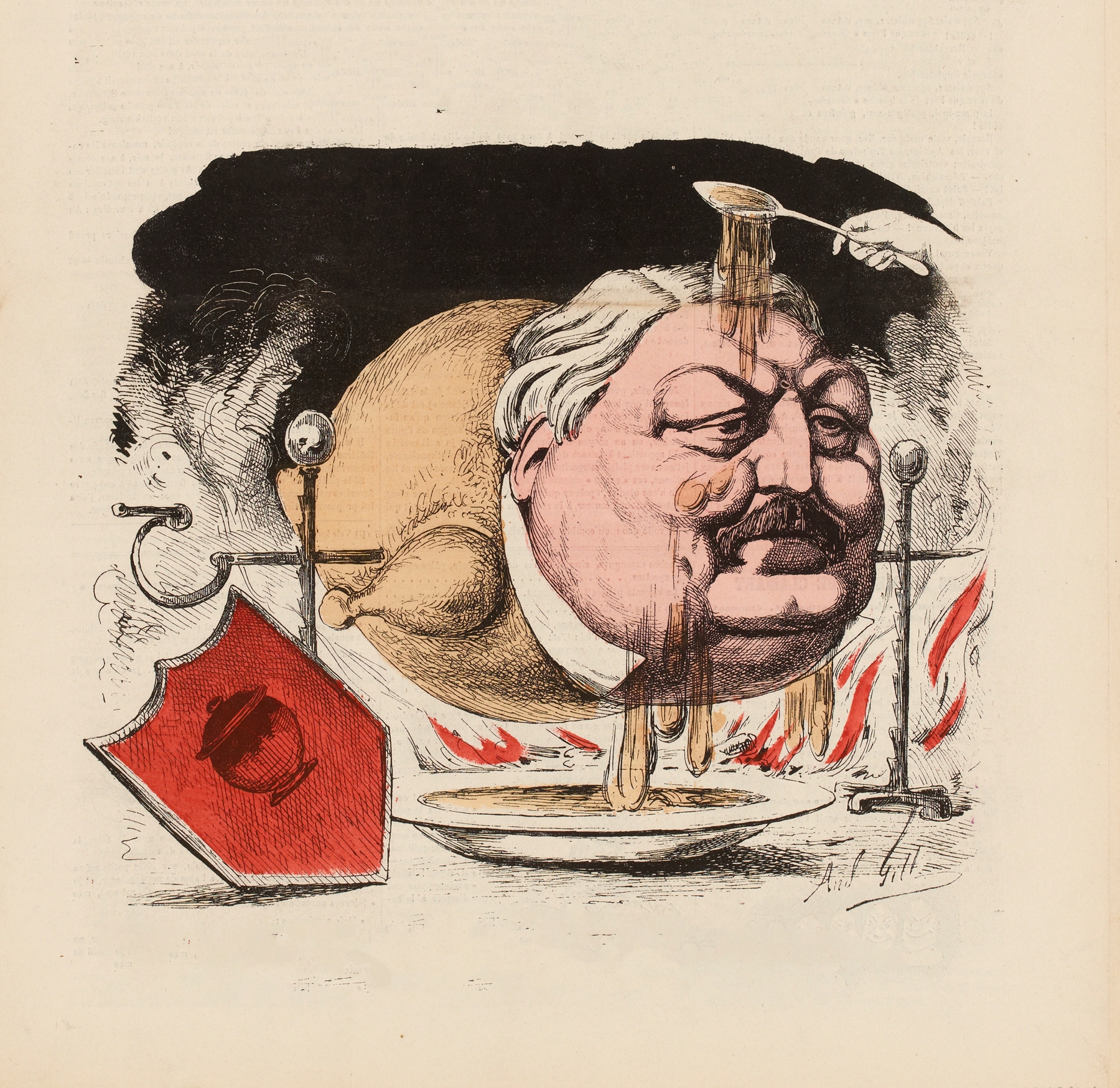In 1868, Gill faced a lawsuit after drawing a pumpkin that was believed by the magistrates to represent the head of a judge. Ever since Charles Philipon had drawn a pear to represent Louis Philippe, any fruit drawn by caricaturists was believed to carry satirical value and was suspect in the eyes of the court. Gill’s lawsuit brought him fame –as well as a prison sentence. He was, however, released after a short time.