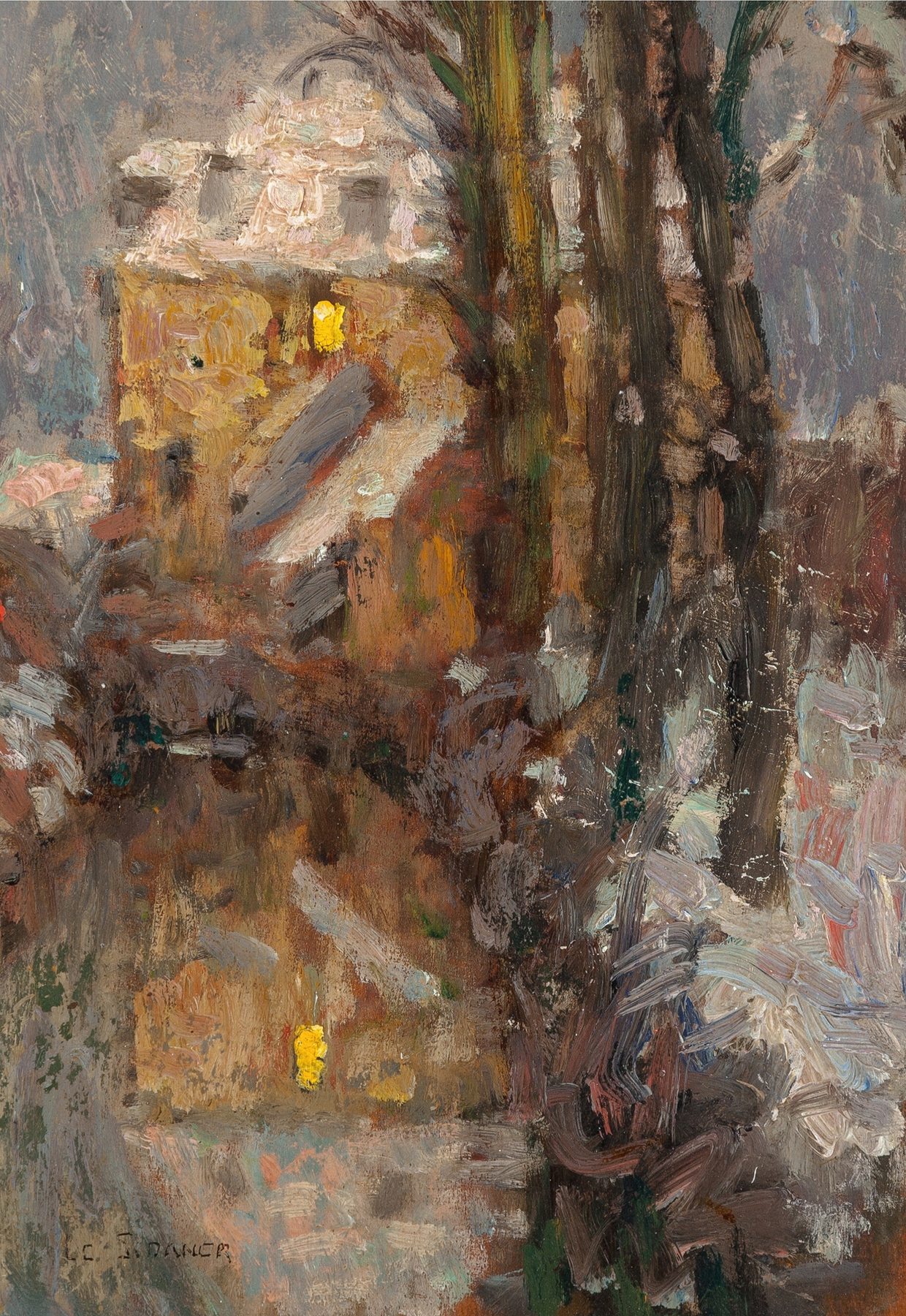 Henri Eugène Augustin Le Sidaner who was a contemporary of the Post-impressionists, was an intimist painter known for his paintings of domestic interiors and quiet street scenes. His style contained elements of impressionism with the influences of Édouard Manet, Monet and of the Pointillists discernible in his work. Le Sidaner favoured a subdued use of colour, preferring nuanced greys and opals applied with uneven, dappled brushstrokes to create atmosphere and mysticism. A skilled nocturne painter he travelled widely throughout France and Europe before settling at Gerberoy in the Picardy countryside from where he painted for over thirty years.