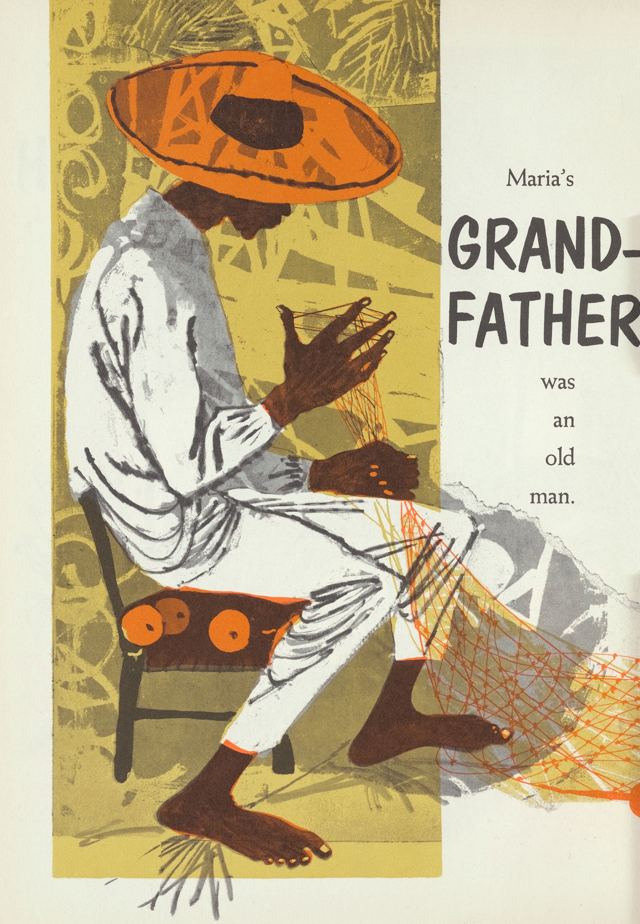According to Charles Bayless at the bookshop Through the Magic Door, the 1960s were a time of experiment in illustration for children, with some fashion for “drawings with sharp, angular figures, muted colors and representational or cartoon-like styles”, which helped Ness to thrive. The first story she both wrote and illustrated was Josefina February (Scribners, 1963), after visiting Haiti for one year. It was set in Haiti, about a girl’s search for a lost burro, with a series of woodcuts. Or her first was A Gift for Sula Sula (Scribners, 1963).