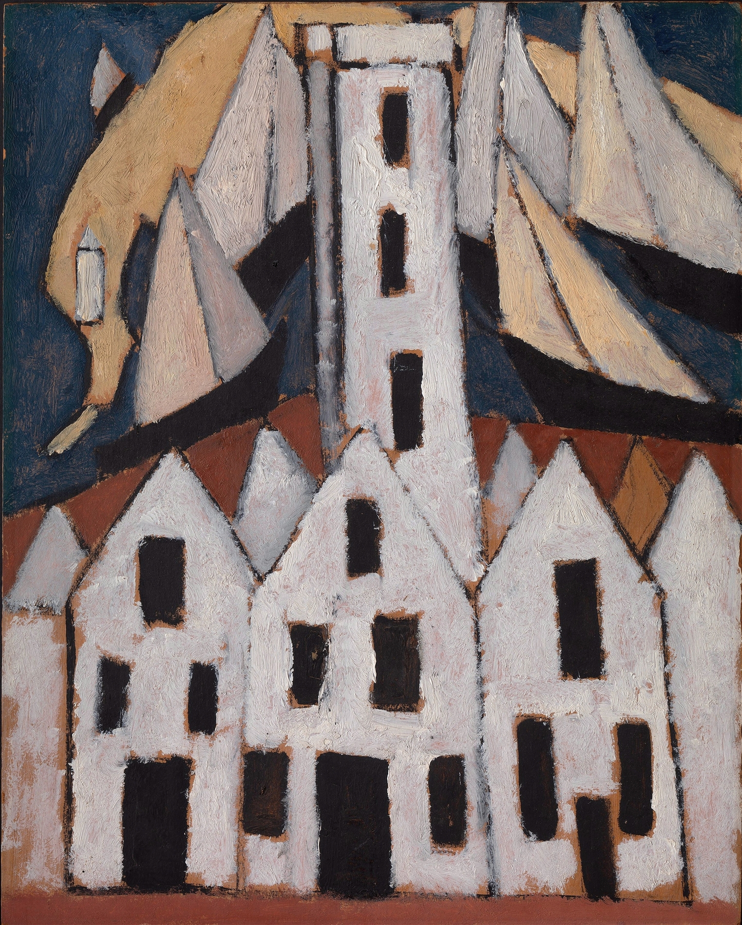 Hartley spent a productive summer in 1916 in the company of Charles Demuth and Eugene O’Neill in Provincetown, Massachusetts. The Cape Cod resort was a favorite spot for artists, writers, and actors. Within this small format, several houses, sailboats, and the tall Pilgrim Monument are compressed into flat, geometric forms. Hartley’s titles from the 1910s, such as Movement, Symphony, and Arrangement —like those first used by Whistler, suggest musical analogies for visual imagery.