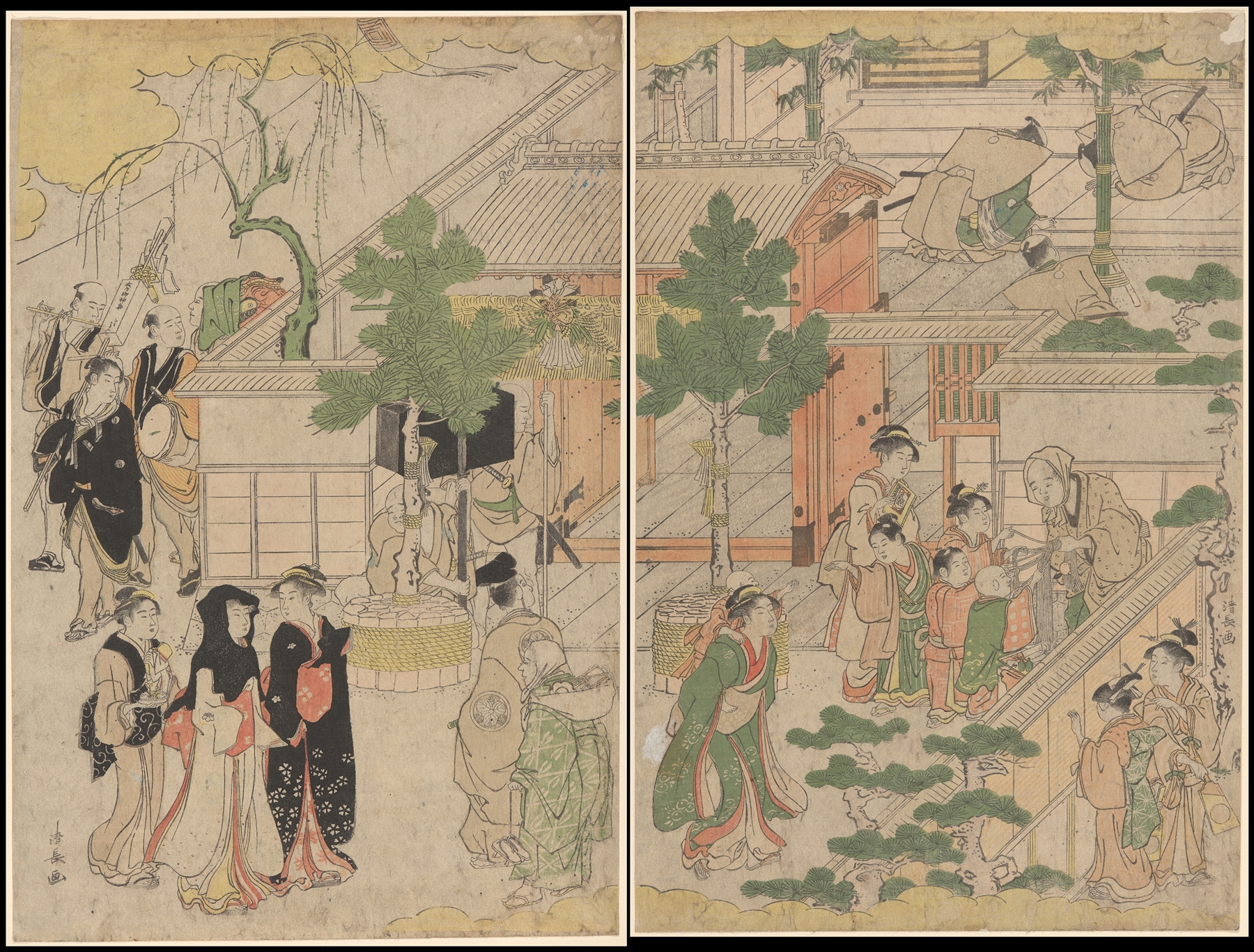 Kiyonaga is considered one of the great masters of the full-color nishiki-e print and of bijin-ga, images of courtesans and other beautiful women. Like most ukiyo-e artists, however, he also produced a number of prints and paintings depicting Kabuki actors and related subjects, many of them promotional materials for the theaters. He also produced a number of shunga, or erotic images.