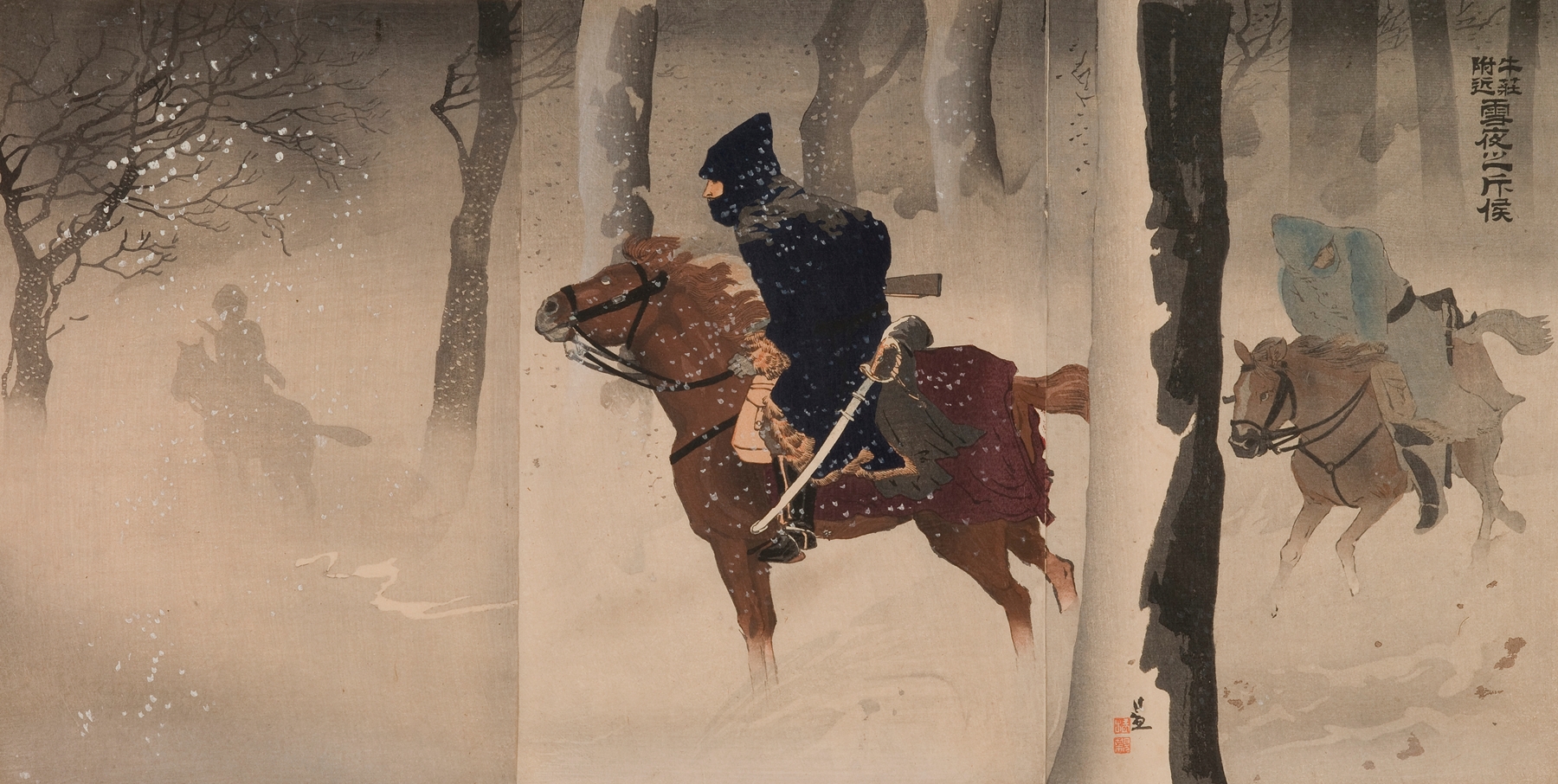 Scouts near Nuizhuang on a Snowy Night by Kobayashi Kiyochika printed on a T-Shirt