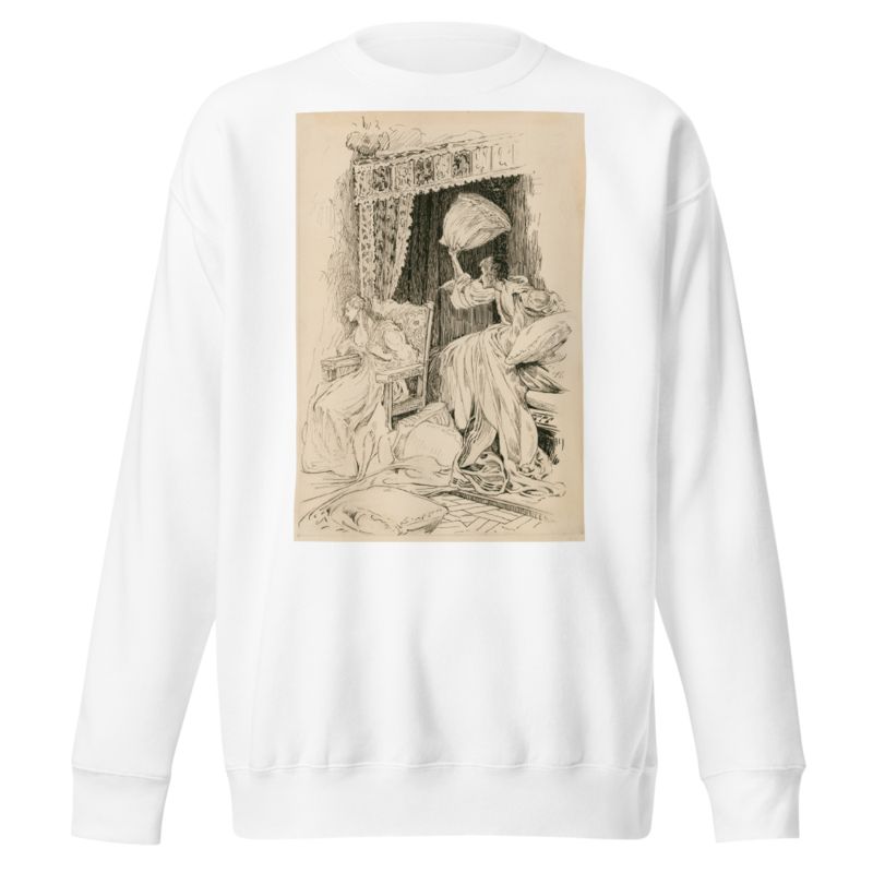 Taming of the Shrew, throwing the pillows & bedclothes about the room, so that she was forced to sit down in a chair by Louis Rhead printed on a Sweatshirt