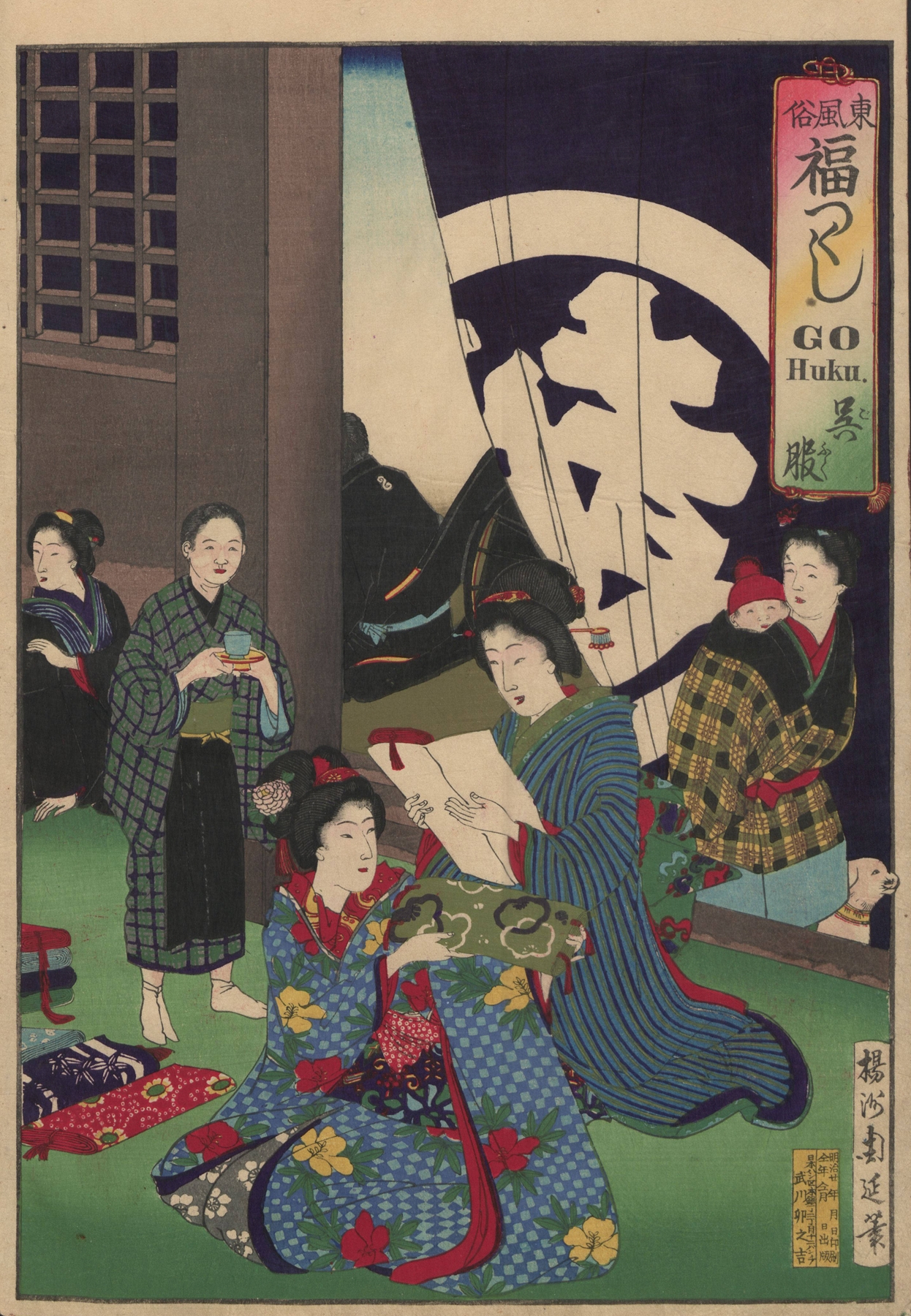Like many ukiyo-e artists, Chikanobu turned his attention towards a great variety of subjects. His work ranged from Japanese mythology to depictions of the battlefields of his lifetime to women’s fashions. As well as a number of the other artists of this period, he too portrayed kabuki actors in character, and is well known for his impressions of the mie (mise en scène) of kabuki productions. Chikanobu was known as a master of bijinga. images of beautiful women, and for illustrating changes in women’s fashion, including both traditional and Western clothing. His work illustrated the changes in coiffures and make-up across time. For example, in Chikanobu’s images in Mirror of Ages (1897), the hair styles of the Tenmei era, 1781-1789 are distinguished from those of the Keiō era, 1865-1867. His works capture the transition from the age of the samurai to Meiji modernity, the artistic chaos of the Meiji period exemplifying the concept of “furumekashii/imamekashii”.