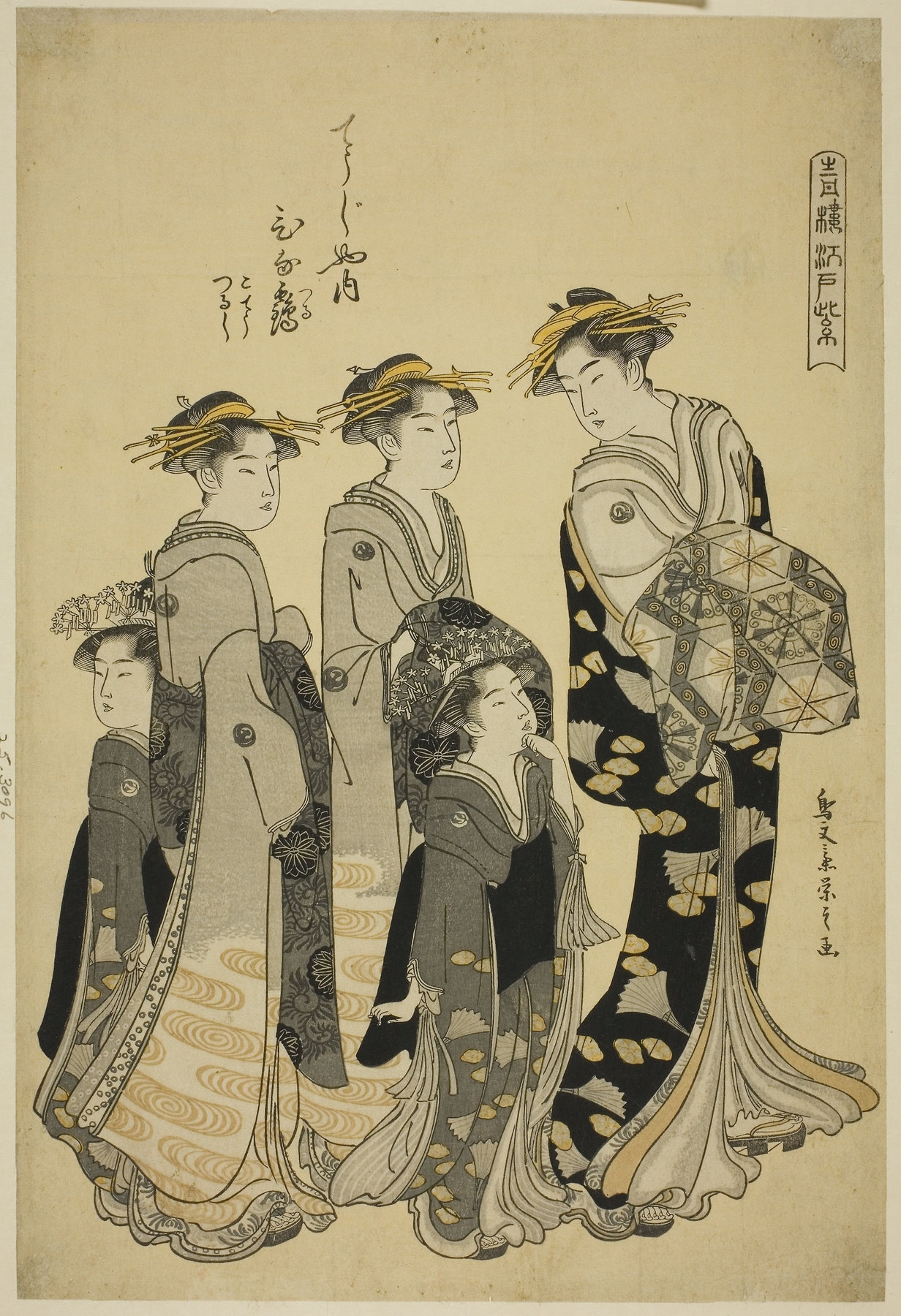 Chōbunsai Eishi was a Japanese ukiyo-e artist. His last name was Hosoda (細田). His first name was Tokitomi (時富). His common name was Taminosuke (民之丞) and later Yasaburo (弥三郎). Pupil of Kano Eisen’in Michinobu (狩野 栄川院 典信). Born as the first son of direct vassal of the Shogunate, a well-off samurai family that was part of the Fujiwara clan. Eishi was a vassal of the Shogunate with a generous stipend of 500 ‘koku’ (90,000 litres) of rice.