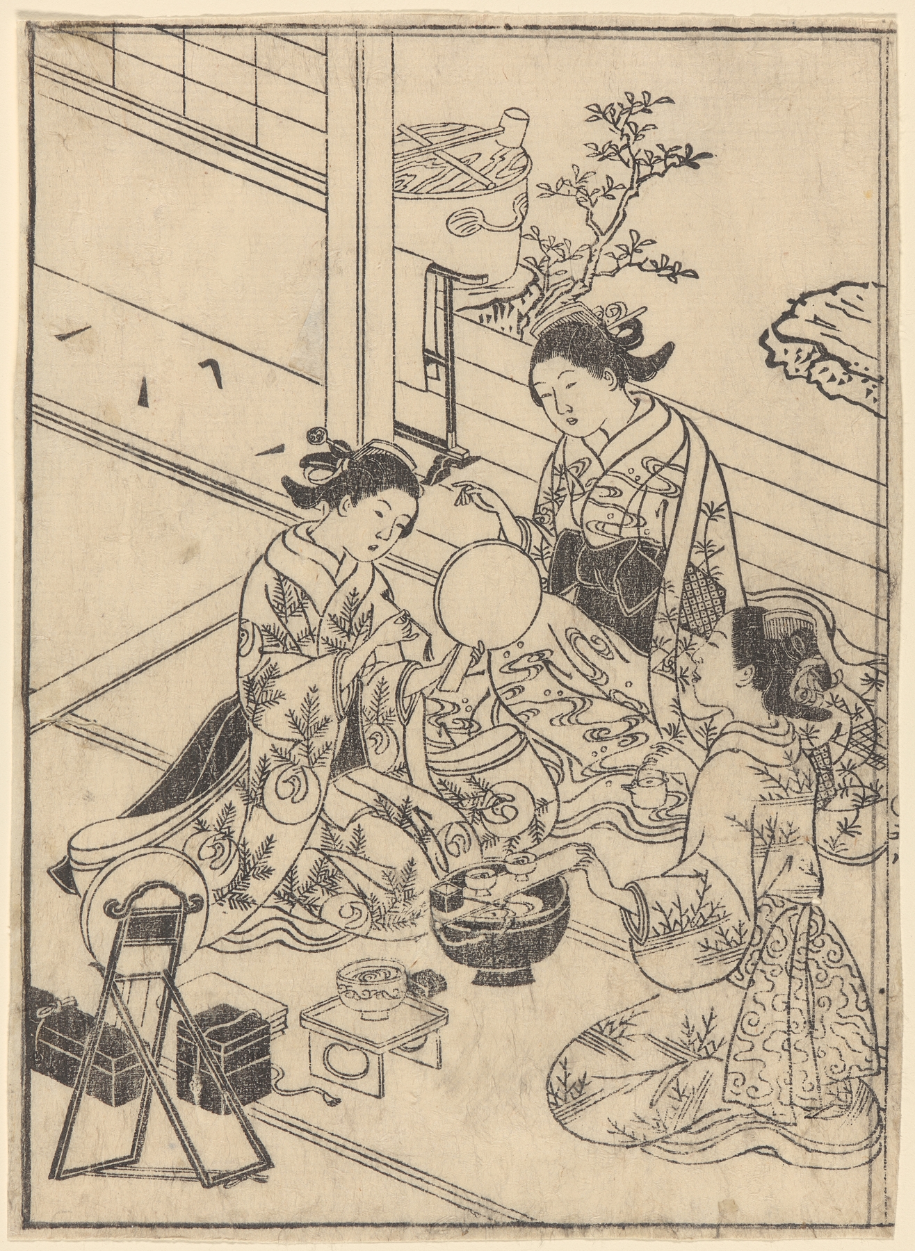 Nishikawa Sukenobu was born in Kyoto in 1671 and studied painting there under Kanō Einō of the Kanō school of painting; he may also have studied under Tosa Mitsusuke of the Tosa school. Sukenobu’s earliest known works are book illustrations that date to 1699; the earliest signed in his name is the seven-volume Shin Kanninki (“New patience story”). While most ukiyo-e artists were based in Edo (modern Tokyo), Sukenobu spent his career in Kyoto.