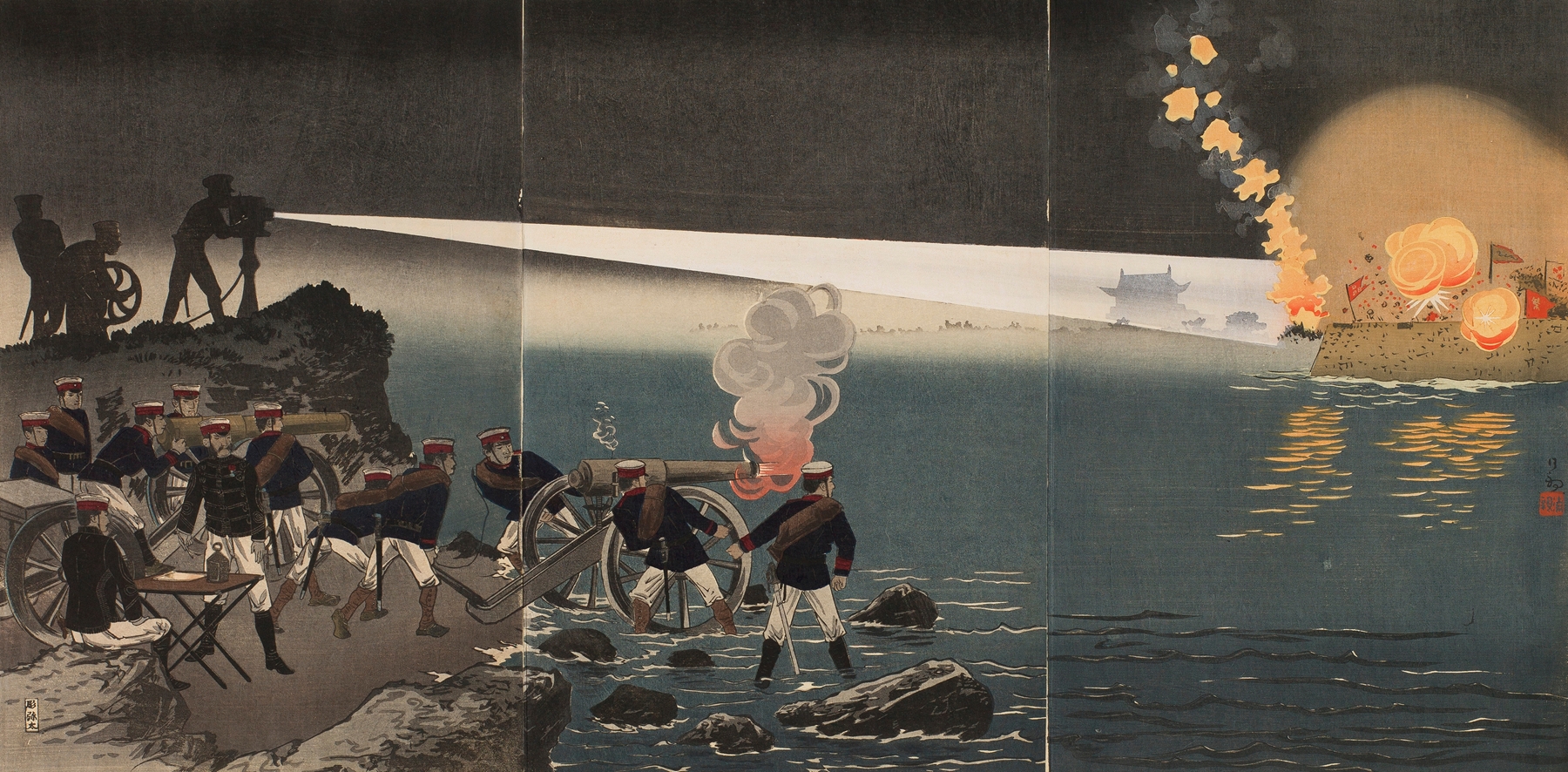 Kobayashi Kiyochika designed numerous propagandistic prints during the Sino-Japanese War of 1894–95 and, a decade later, the Russo-Japanese War. This work celebrates achievements in military technology. Japanese soldiers use electric search lights to illuminate their firing target—Chinese troops in Pyongyang, in northern Korea, which is shown ablaze in the background.