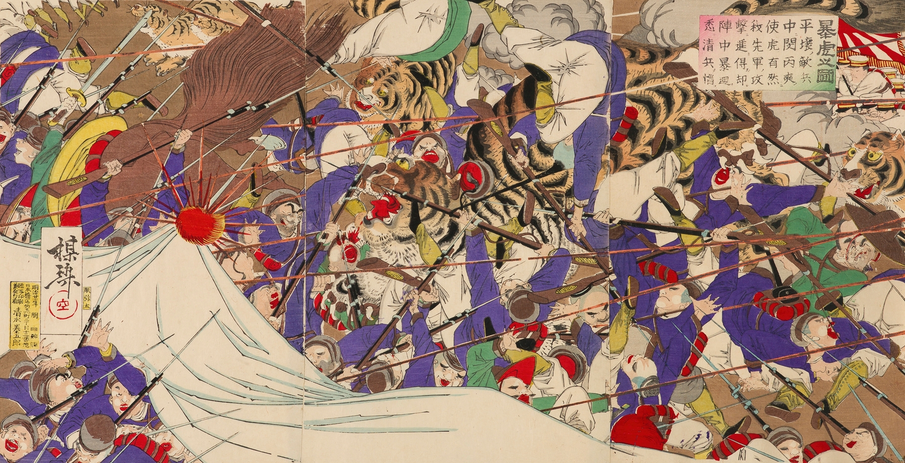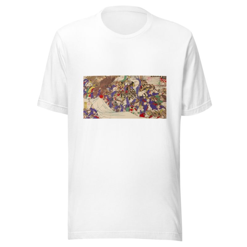 Tigers Attacking Chinese Soldiers during the Battle of Pyeongyang by Watanabe Nobukazu printed on a T-Shirt