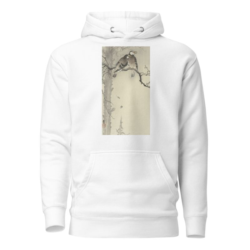Two gray starlings by Ohara Koson printed on a Hoodie